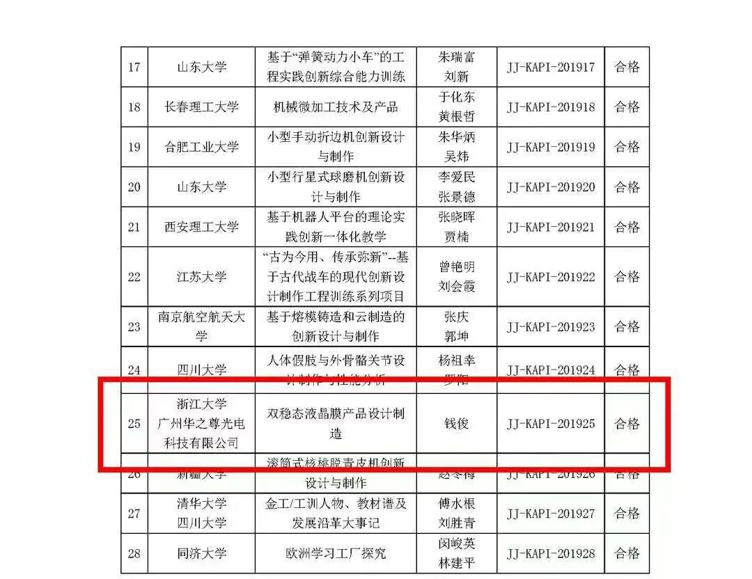 經教育部機械基礎課程教學指導分委員會研究決定,于2022年1月對 2019KAPI一體化培養(yǎng)方法教學研究項目進行結題驗收。經過專家組對提交的教學研究項目結題資料進行審查和評審,同時經教指委審核批準。浙江大學和廣州華之尊光電科技有限公司的KAPI一體化培養(yǎng)項目“激光精密加工與新材料、新技術、新工藝的綜合應用實踐—雙穩(wěn)態(tài)液晶膜產品設計制造”順利結題驗收。