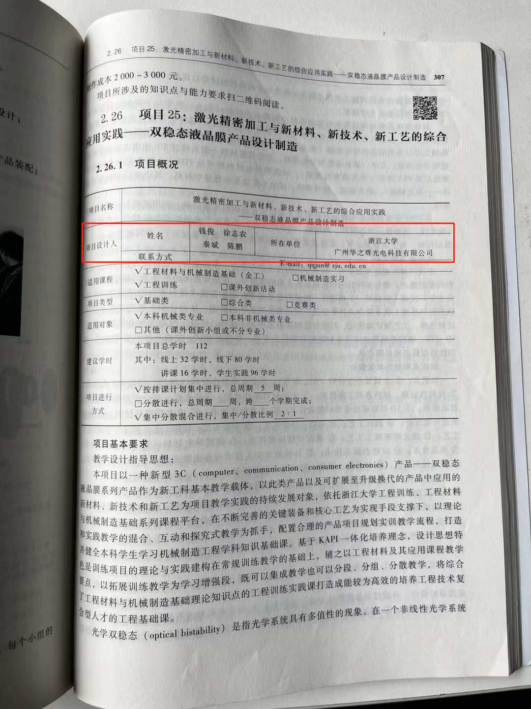 激光精密加工與新材料、新技術、新工藝的綜合應用實踐—雙穩(wěn)態(tài)液晶膜產品設計制造項目是由浙江大學和廣州華之尊光電科技有限公司基于新材料、新技術、新工藝共同推出的新型教材。項目以新型3C產品一雙穩(wěn)態(tài)液晶膜系列產品作為新工科基本教學教體,項目依托浙江大學工程訓練、工程材料與機械制造基礎系列課程平臺,在不斷完善的關鍵裝備和核心工藝為實現(xiàn)手段支撐下,以理論和實踐教學的混合、互動和探究式教學為抓手,配置合理的產品項目規(guī)劃實訓教學流程,打造并健全本科學生學習機械制造工程學科知識基礎課?;贙API一體化培養(yǎng)理念,設計思想特色是訓練項目的理論與實踐建構在常規(guī)訓練教學的基礎上,輔之以工程材料及其應用課程教學要點,以拓展訓練教學為學習增強段,既可以集成教學也可以分段、分組、分散教學,將綜合了工程材料與機械制造基礎理論知識點的工程訓練實踐課打造成能較為高效的培養(yǎng)工程技術復合型人才的工程基礎課。
