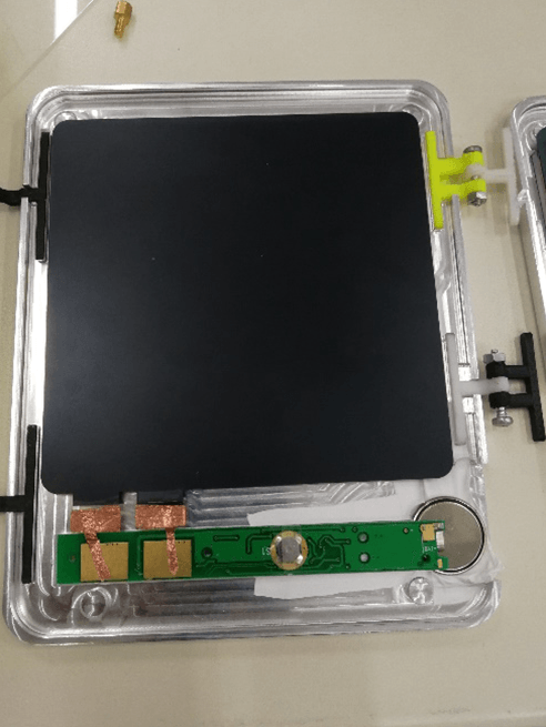 第二大困難是電路板的連接問題.由于我們需要把電路板和電池舒適地放置在槽中,我們把電路板進(jìn)行了稍微的改造,用導(dǎo)電帶實(shí)現(xiàn)正負(fù)極連接,使電池得以平放.然而由于電路板與液晶膜極其敏感脆弱,研究如何連接才能使其正常工作花了我們較長時間,甚至燒壞了不止一塊電路板.
