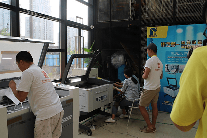 ▲.華之尊工作人員協(xié)助選手使用激光雕刻切割機