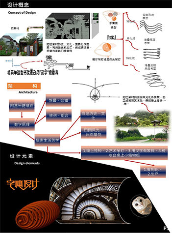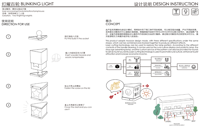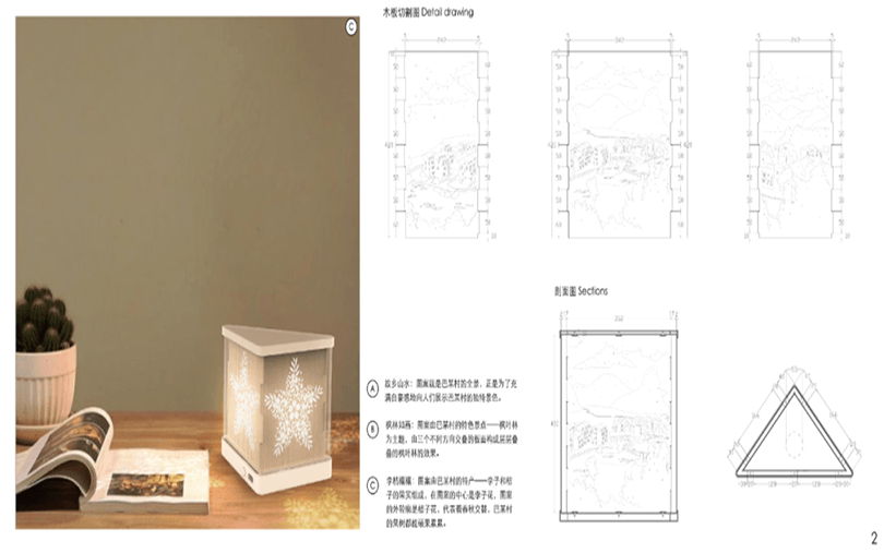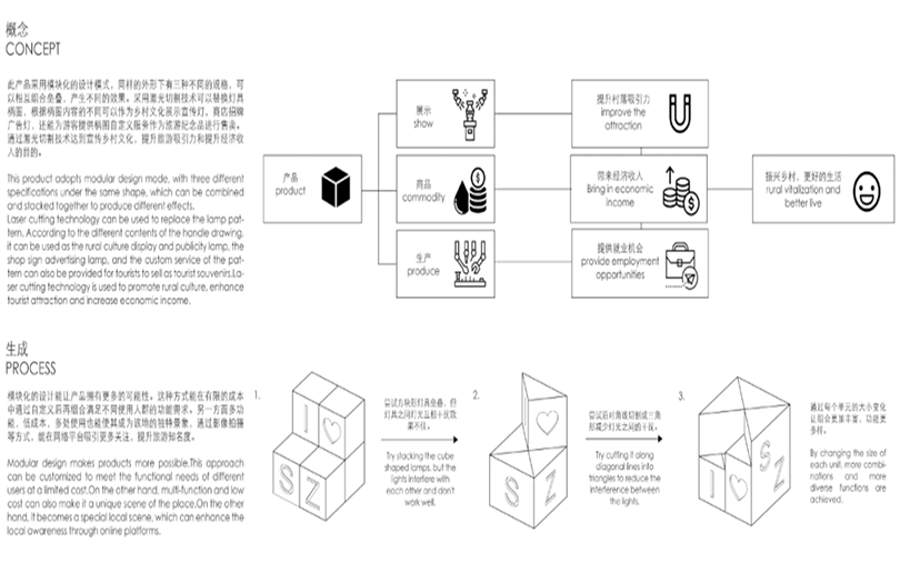 設計說明:四塊亞克力板上刻有標牌、農家、房屋和山水畫等元素。線條勾勒出農民和別墅,反映出簡單的鄉(xiāng)村生活。鄰里相見,表現(xiàn)出和諧美好的人際關系。山脈、河流代表了寧靜舒適的鄉(xiāng)村生活。根據(jù)自身的文化傳統(tǒng)和農村的實際需要,探索鄉(xiāng)村振興之路。
