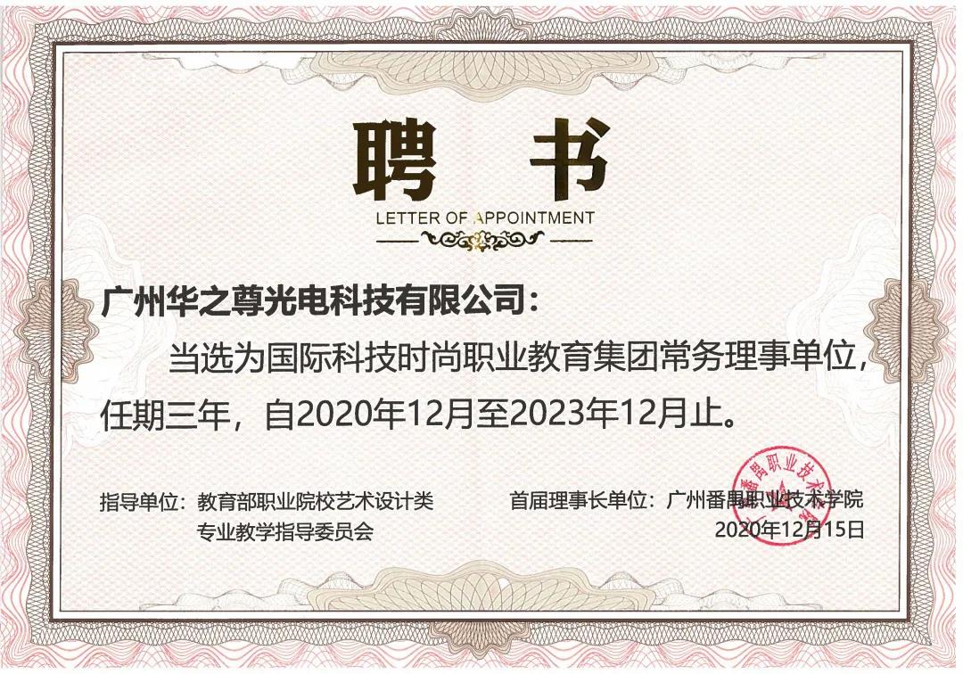 教育向善,共生未來!世界因你而溫暖!廣州華之尊光電科技有限公司榮獲國際科技時尚職業(yè)教育集團常務理事單位。華之尊激光秦斌總經(jīng)理榮獲“雙高”建設項目——廣州番禺職業(yè)技術(shù)學院設計專業(yè)群建設指導委員會委員、國際科技時尚產(chǎn)教聯(lián)盟商務理事。