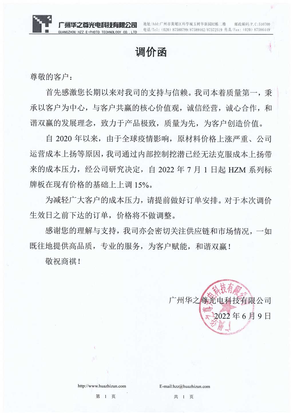 自2020年以來,由于全球疫情影響,原材料價格上漲嚴(yán)重、公司運營成本上揚等原因,我司通過內(nèi)部控制挖潛已經(jīng)無法克服成本上揚帶來的成本壓力,經(jīng)公司研究決定,自2022年7月1日起HZM系列標(biāo)牌板在現(xiàn)有價格的基礎(chǔ)上上調(diào)15%。