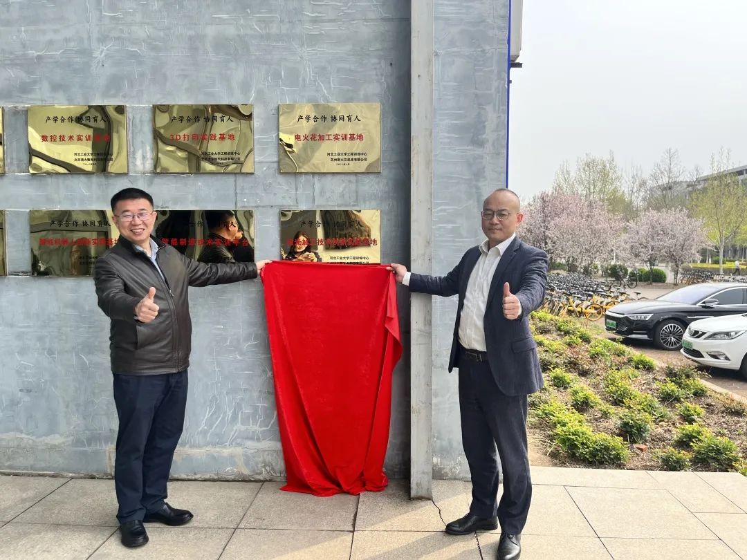 河北工業(yè)大學(xué)工程訓(xùn)練中心馬主任(左)與廣州華之尊光電科技有限公司秦斌總經(jīng)理(右)為『激光加工技術(shù)創(chuàng)新實踐基地』揭牌。