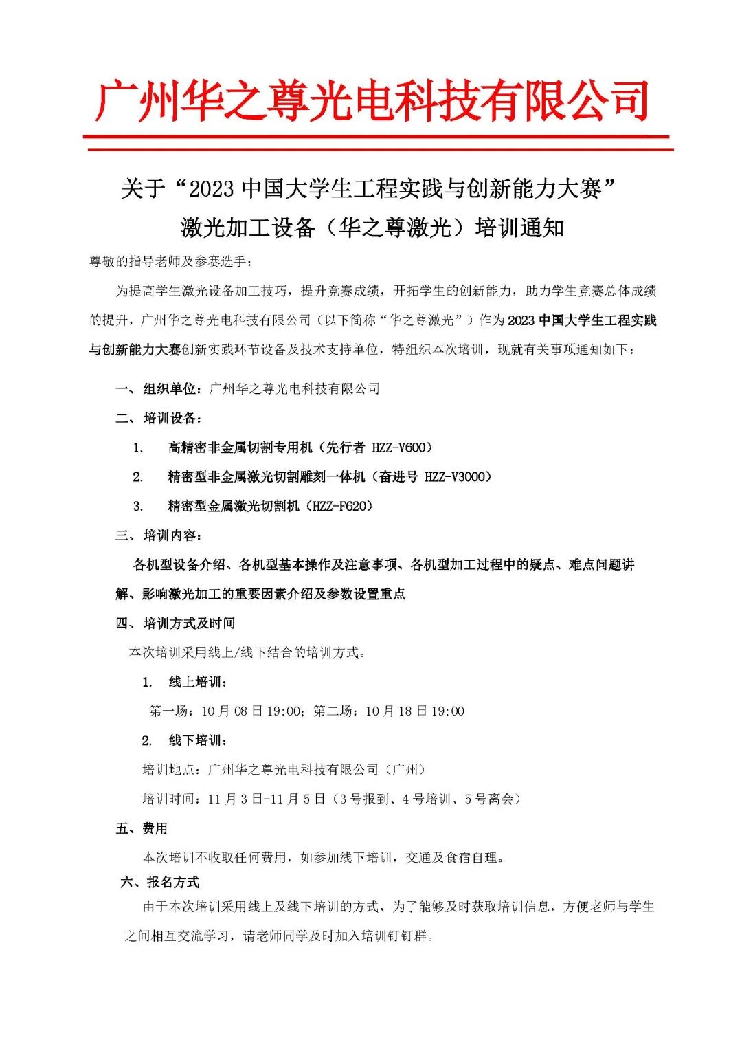 為提高學(xué)生激光設(shè)備加工技巧,提升競(jìng)賽成績(jī),開(kāi)拓學(xué)生的創(chuàng)新能力,助力學(xué)生競(jìng)賽總體成績(jī)的提升,廣州華之尊光電科技有限公司(以下簡(jiǎn)稱(chēng)“華之尊激光”)作為2023 中國(guó)大學(xué)生工程實(shí)踐與創(chuàng)新能力大賽創(chuàng)新實(shí)踐環(huán)節(jié)設(shè)備及技術(shù)支持單位,特組織本次培訓(xùn)。
