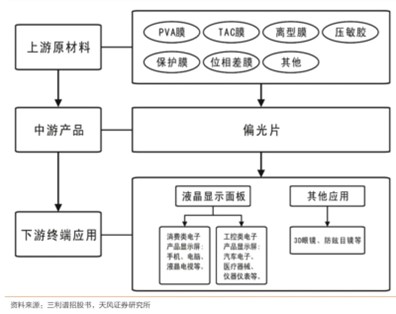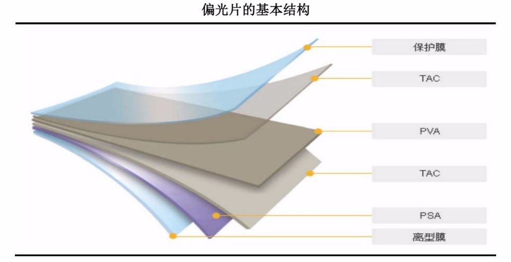 偏光片的全稱是偏振光片,是一種具有特殊光學特性的材料,能夠選擇性地吸收、透射或反射特定方向的光線,從而實現(xiàn)光的偏振作用。主要由TAC膜、PVA膜、保護膜、增量膜、壓敏膠、相位差膜等復合而成,具有高度透明性和柔韌性?;窘Y(jié)構(gòu)是兩層TAC膜,夾一層拉伸后的PVA膜。通過調(diào)整不同的膜材料構(gòu)成可以滿足偏光片的高耐性、不同厚度等要求。